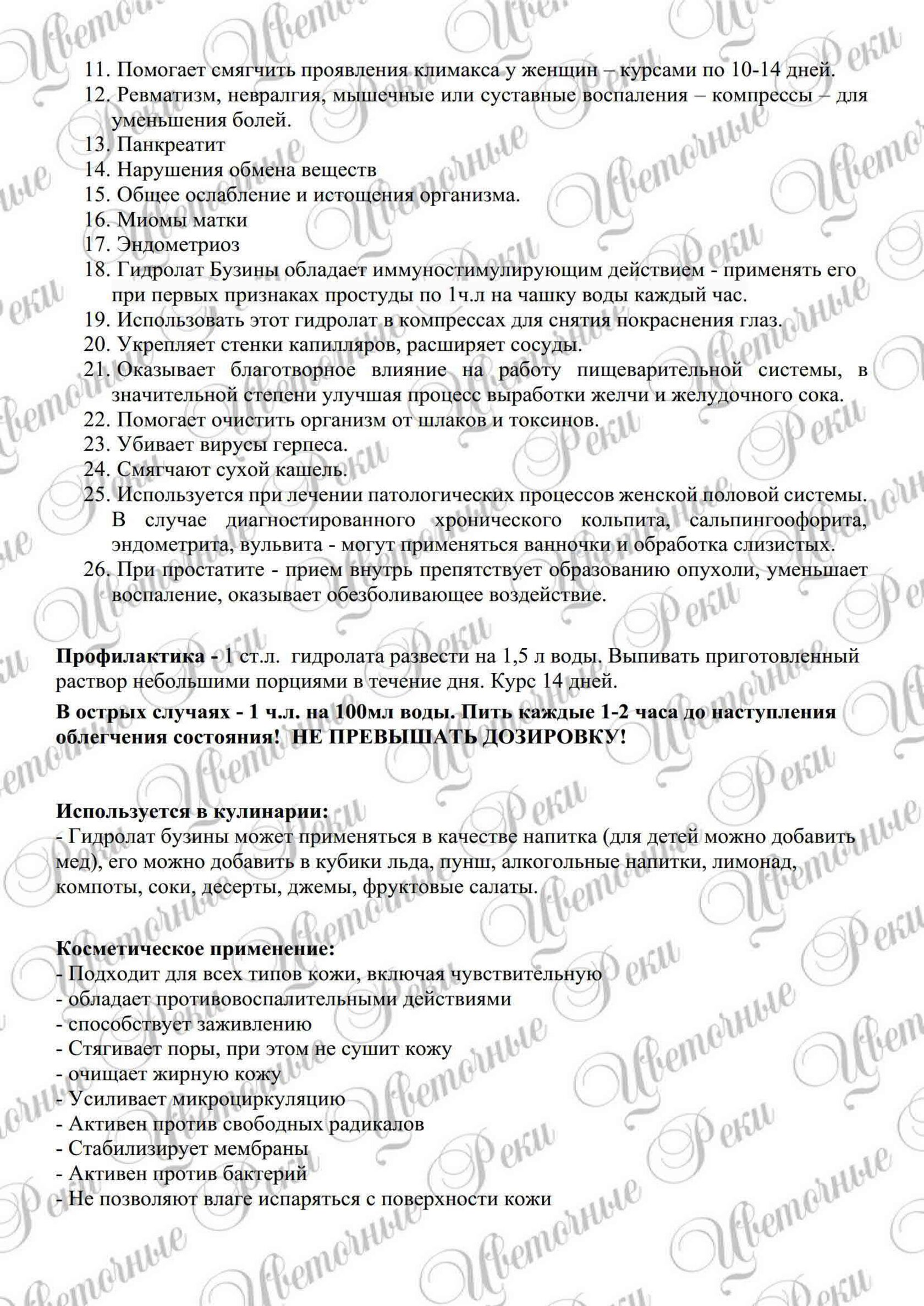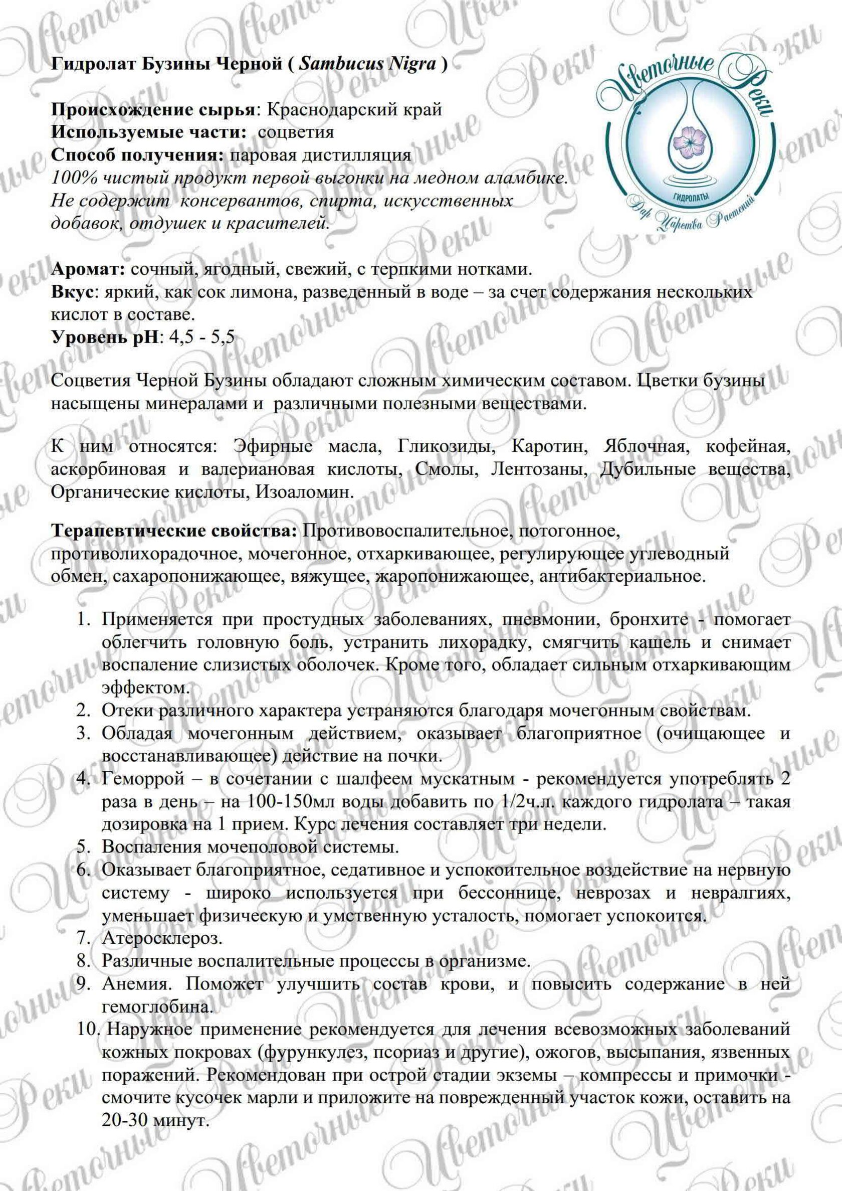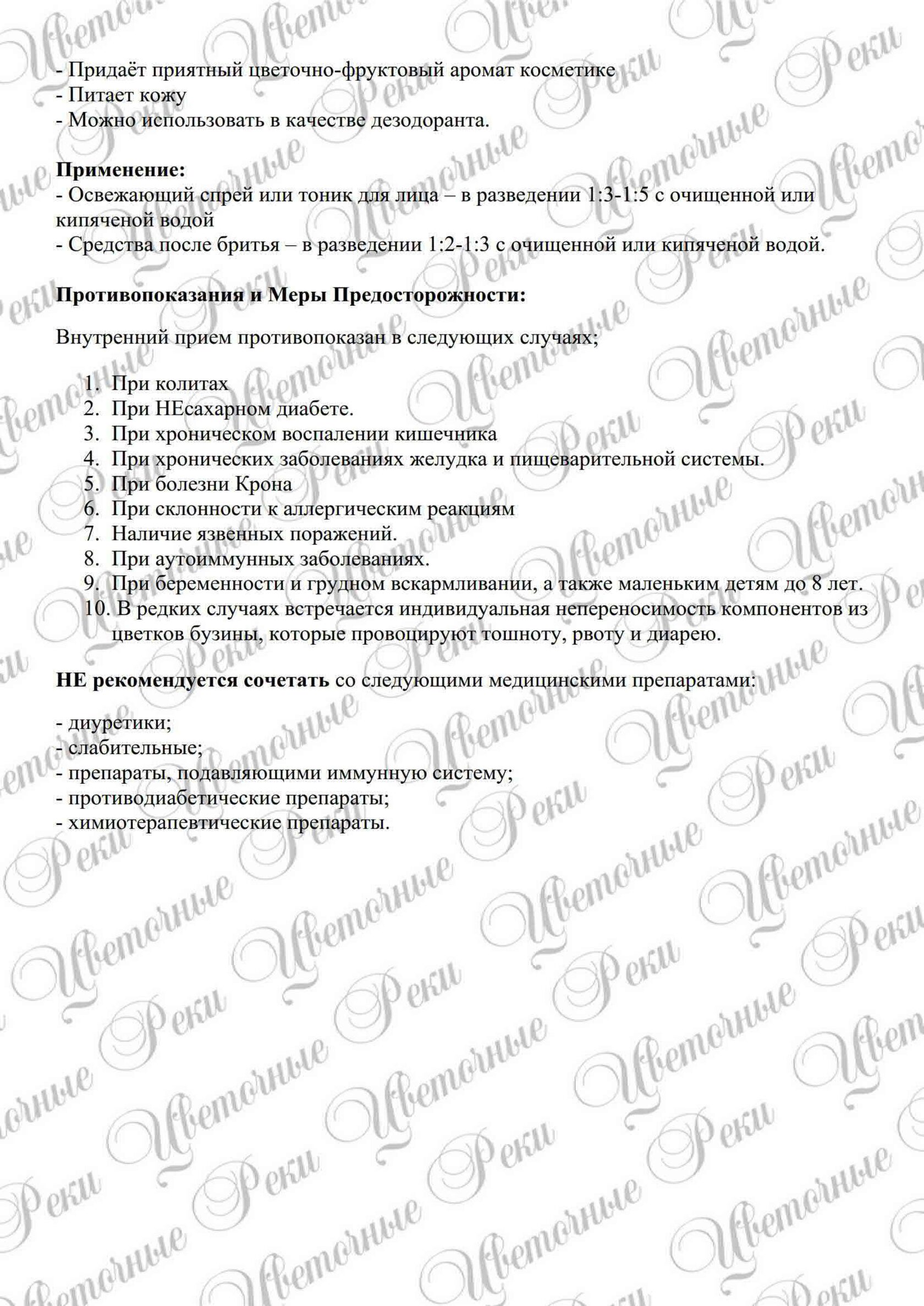 Аромат:сочный, ягодный, свежий, с терпкими нотками. Свойства:противовоспалительное, потогонное, противолихорадочное, мочегонное, отхаркивающее, регулирующее углеводный обмен, сахаропонижающее, вяжущее, жаропонижающее, антибактериальное. Косметическое применение: подходит для всех типов кожи, включая чувствительную, обладает противовоспалительными действиями, способствует заживлению, стягивает поры, при этом не сушит кожу, очищает жирную кожу, усиливает микроциркуляцию, активен против свободных радикалов, активен против бактерий, не позволяют влаге испаряться с поверхности кожи, придает приятный цветочно-фруктовый аромат косметике, питает кожу, можно использовать в качестве дезодоранта.