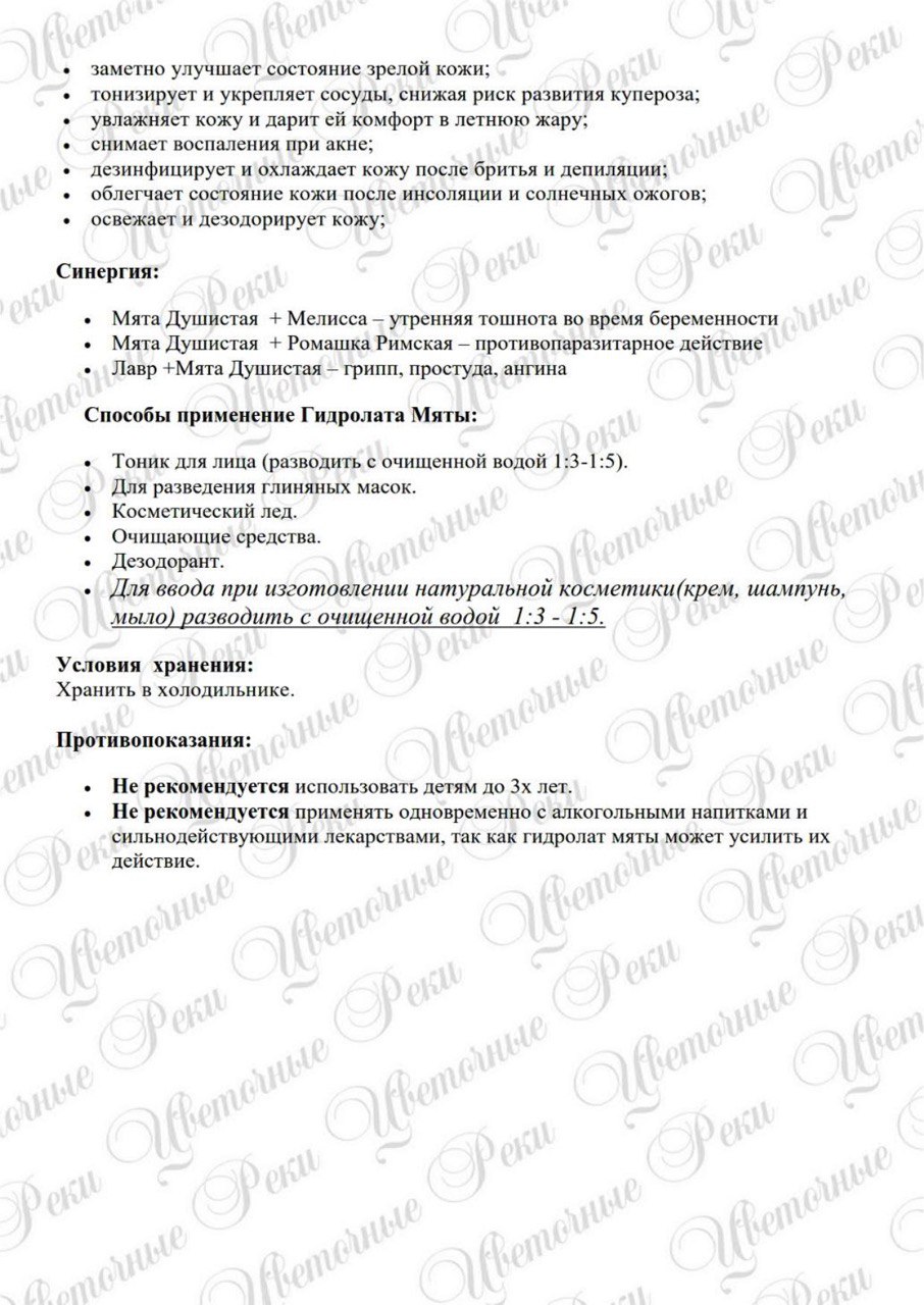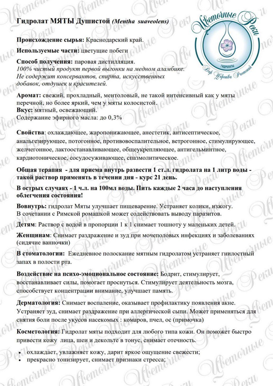 Аромат очень свежий, прохладный, ментоловый, не такой интенсивный как у мяты перечной, но более яркий, чем у мяты колосистой. Терапевтические свойства: охлаждающее, жаропонижающее, анестетик, антисептическое, анальгезирующее, потогонное, противовоспалительное, ветрогонное, стимулирующее, желчегонное, лактоостанавливающее, общеукрепляющее, антигельминтное, кардиотоническое, сосудосуживающее, спазмолитическое. В косметология: Гидролат Мяты подходит для любого типа кожи. Он поможет быстро привести кожу лица, шеи и декольте в тонус, снимает отечность. Прекрасно освежает и охлаждает в летний зной, особенно хорошо подходит тем, кто за рулем и нужно взбодриться!