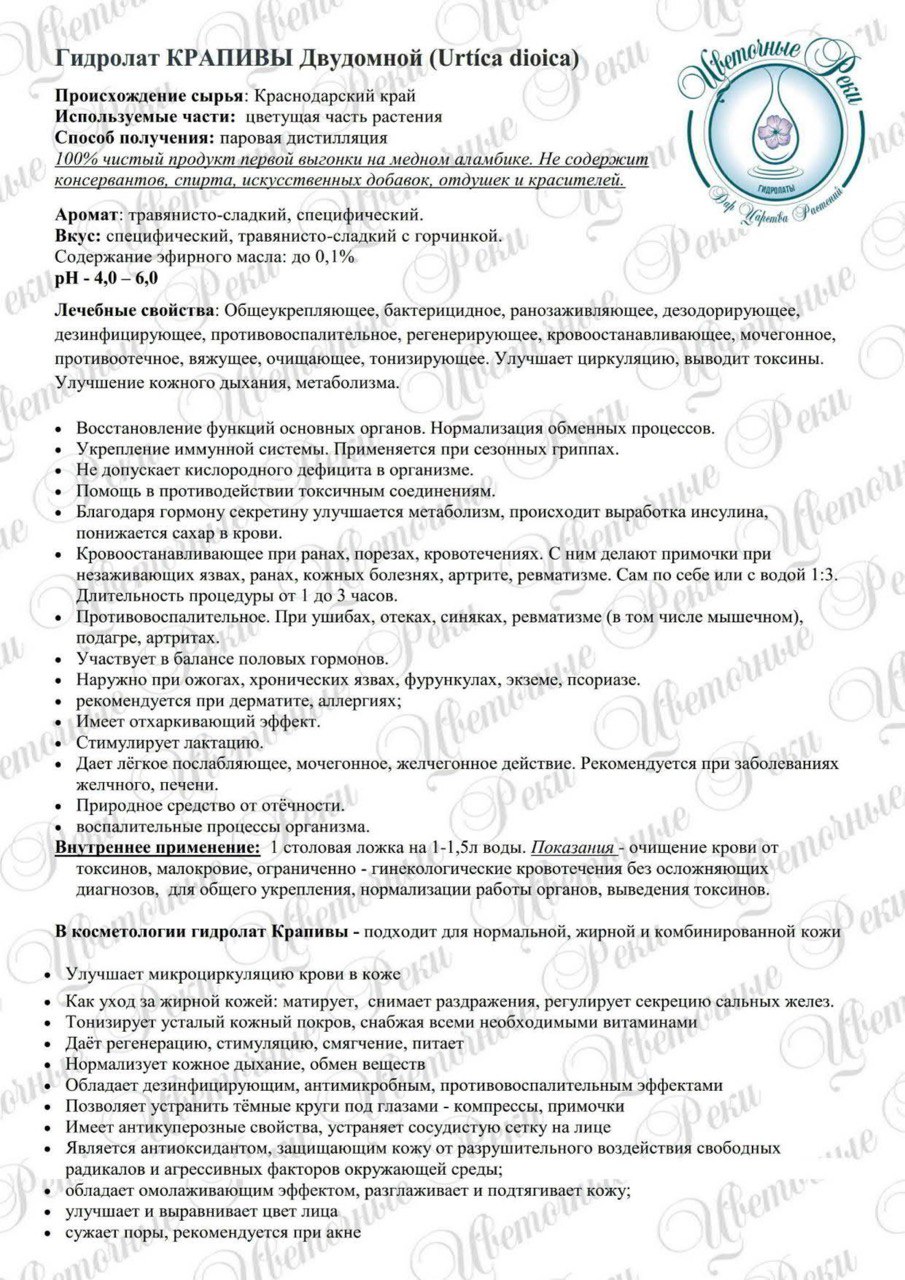 гидролат Крапивы - подходит для нормальной, жирной и комбинированной кожи - матирует, снимает раздражения, регулирует секрецию сальных желез.