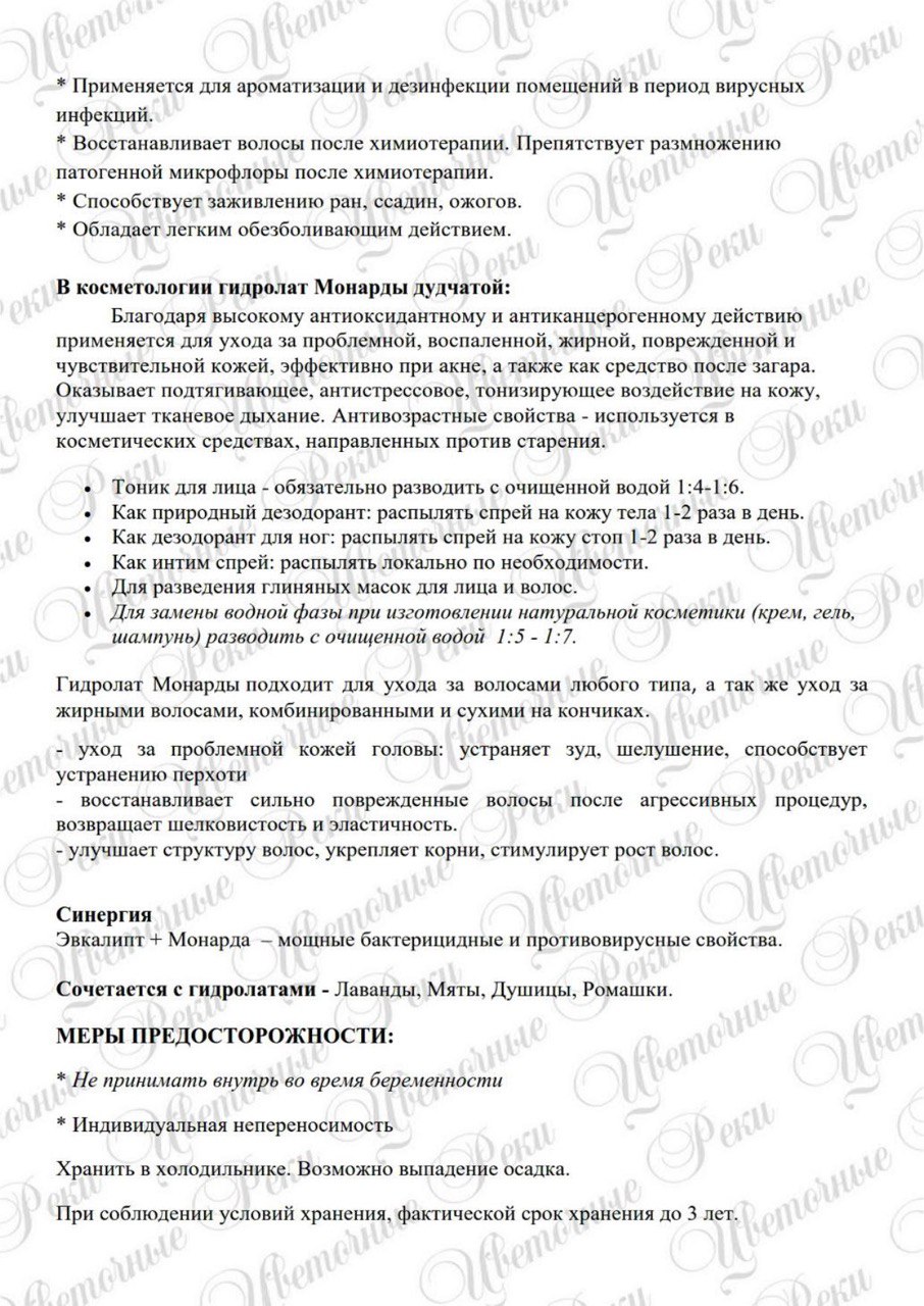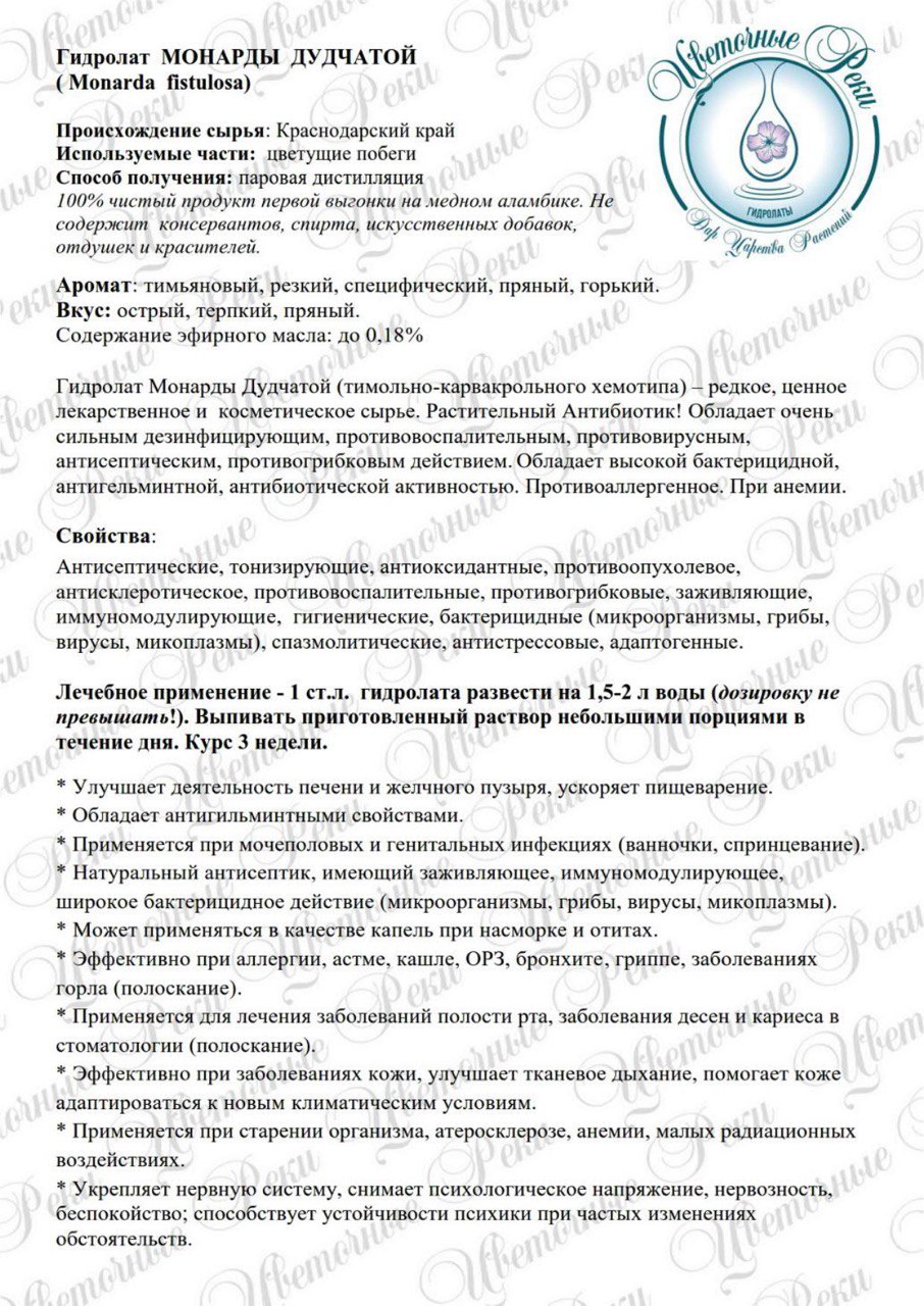Аромат: тимьяновый, резкий, специфический, пряный, горький. Свойства: Антисептические, тонизирующие, антиоксидантные, противоопухолевое, антисклеротическое, противовоспалительные, противогрибковые, заживляющие, иммуномодулирующие, гигиенические, бактерицидные (микроорганизмы, грибы, вирусы, микоплазмы), спазмолитические, антистрессовые, адаптогенные. В косметологии гидролат Монарды дудчатой применяется для ухода за проблемной, воспаленной, жирной, поврежденной и чувствительной кожей, эффективно при акне, а также как средство после загара.