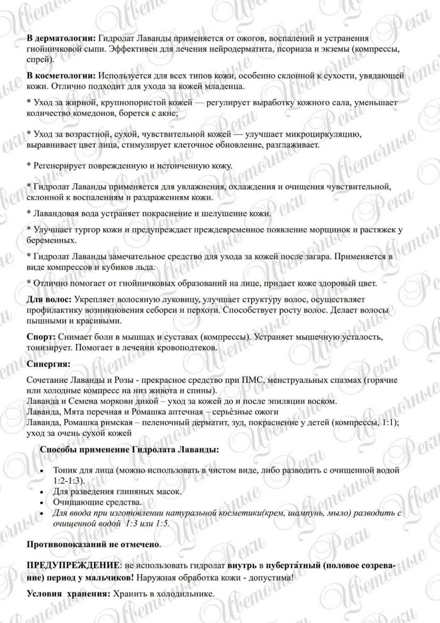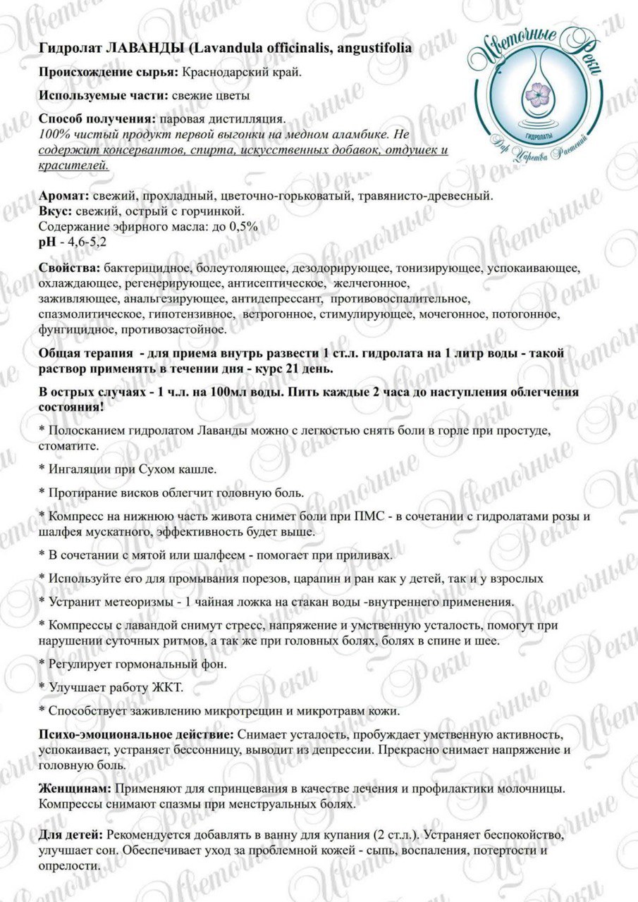 Аромат: свежий, прохладный, цветочно-горьковатый, травянисто-древесный. Терапевтические свойства: бактерицидное, болеутоляющее, дезодорирующее, тонизирующее, успокаивающее, охлаждающее, регенерирующее, антисептическое, желчегонное, заживляющее, анальгезирующее, антидепрессант, противовоспалительное, спазмолитическое, гипотензивное, ветрогонное, стимулирующее, мочегонное, потогонное, фунгицидное, противозастойное. - Очень хорошо помогает при Сухом кашле – ингаляции. - Протирание висков или компресс - облегчит головную боль. - Компресс на нижнюю часть живота - снимет боли при ПМС - в сочетании с гидролатами розы и шалфея мускатного, эффективность будет выше. - Снимает усталость, успокаивает, устраняет бессонницу, выводит из депрессии. Прекрасно снимает напряжение и головную боль. В косметологии: Используется для всех типов кожи, особенно склонной к сухости, увядающей кожи. Отлично подходит для ухода за кожей младенца.