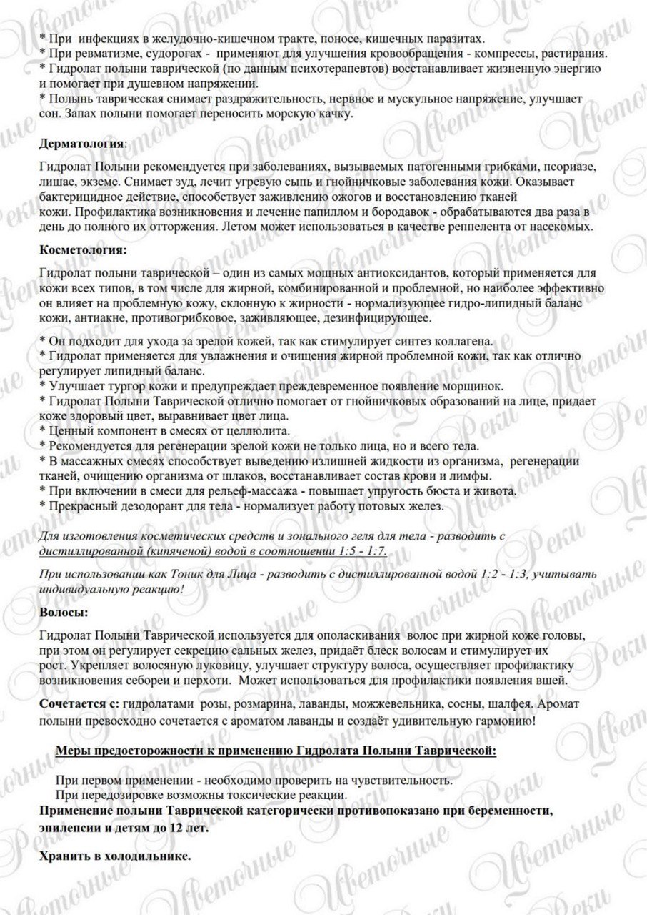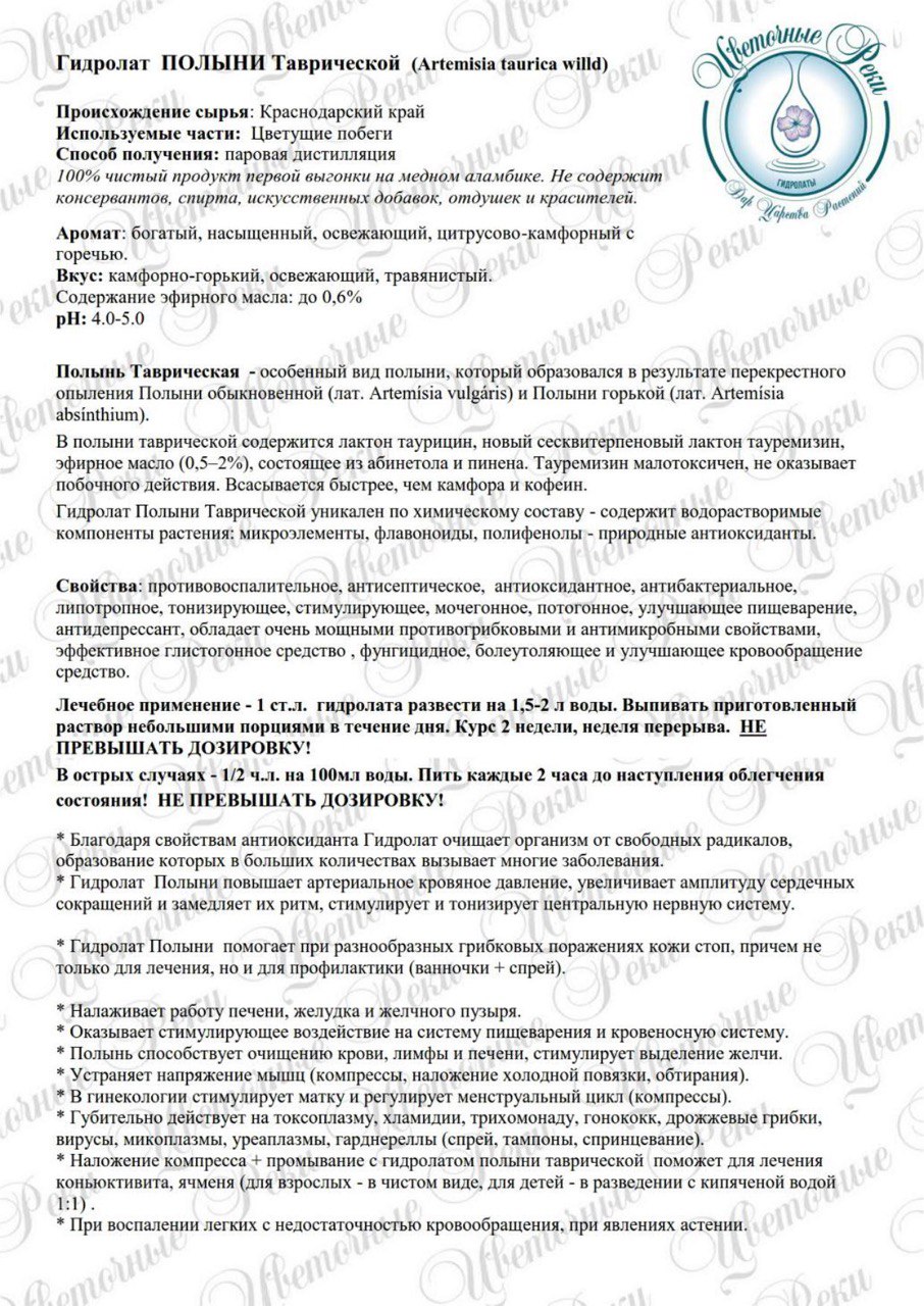 Аромат: богатый, насыщенный, освежающий, цитрусово-камфорный с горечью. Свойства: противовоспалительное, антисептическое, антиоксидантное, антибактериальное, липотропное, тонизирующее, стимулирующее, мочегонное, потогонное, улучшающее пищеварение, антидепрессант, обладает очень мощными противогрибковыми и антимикробными свойствами, эффективное глистогонное средство , фунгицидное, болеутоляющее и улучшающее кровообращение средство. Косметология: гидролат Полыни Таврической – один из самых мощных антиоксидантов, который применяется для кожи всех типов, в том числе для жирной, комбинированной и проблемной, противогрибковое, заживляющее, дезинфицирующее.