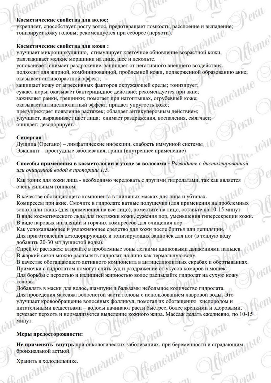 Аромат: пряный, теплый, с камфорными нотками и отголосками терпкости. Лечебные свойства: антисептическое; вяжущее, очищающее, противовоспалительное; антибактериальное; иммунное, антивирусное; противогрибковое; обезболивающее; тонизирующее; стимулирующее, регенерирующее, выводит токсины; улучшает кровообращение; нормализует углеводный обмен; снижает содержание сахара в крови; оказывает дренирующее действие; очищает и тонизирует лимфатическую систему; улучшает функционирование печени и желчного пузыря; борется с метеоризмом и используется для ликвидации кишечных газов. Косметические свойства для кожи : улучшает микроциркуляцию, стимулирует клеточное обновление возрастной кожи, разглаживает мелкие морщинки на лице, шее и декольте. успокаивает, снимает раздражение, защищает от негативного внешнего воздействия. подходит для жирной, комбинированной, проблемной кожи, подверженной образованию акне; оказывает антивозрастной эффект; защищает кожу от агрессивных факторов окружающей среды; тонизирует; сужает поры; оказывает бактерицидное действие.