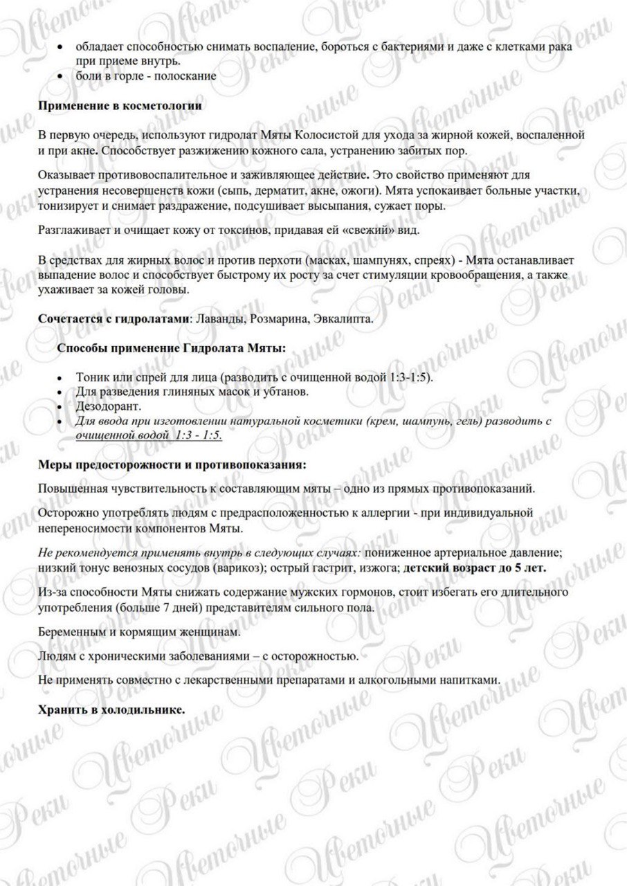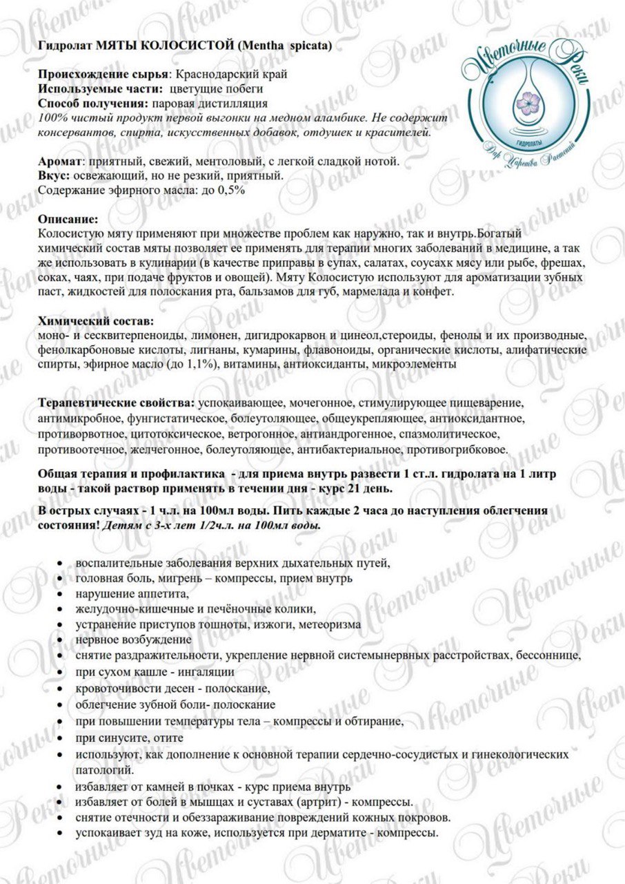 Аромат узнаваемый, поднимающий настроение - он приятный, свежий, ментоловый, с легкой сладкой нотой. Терапевтические свойства: успокаивающее, мочегонное, стимулирующее пищеварение, антимикробное, фунгистатическое, болеутоляющее, общеукрепляющее, антиоксидантное, противорвотное, цитотоксическое, ветрогонное, антиандрогенное, спазмолитическое, противоотечное, желчегонное, болеутоляющее, антибактериальное, противогрибковое. Применение в косметологии В первую очередь, в косметологии используют антисептическое воздействие Мяты Колосистой для ухода за жирной кожей, воспаленной и при акне.
