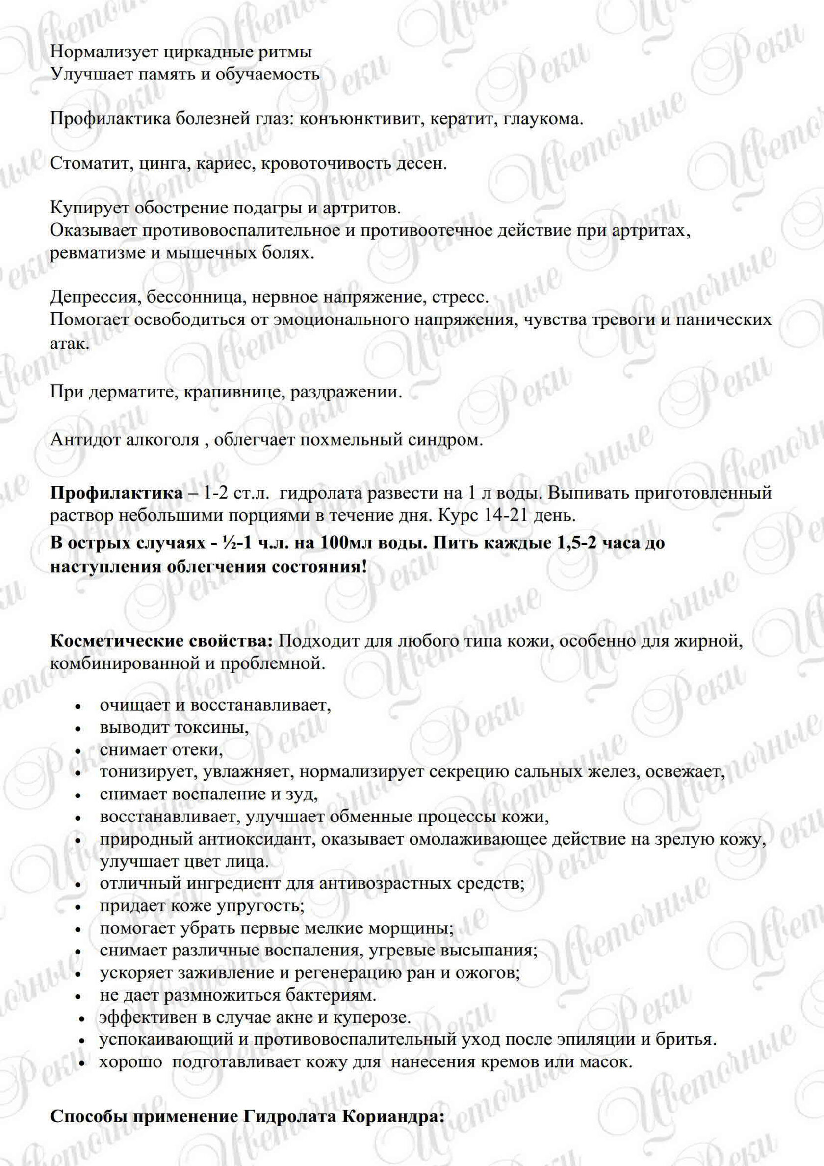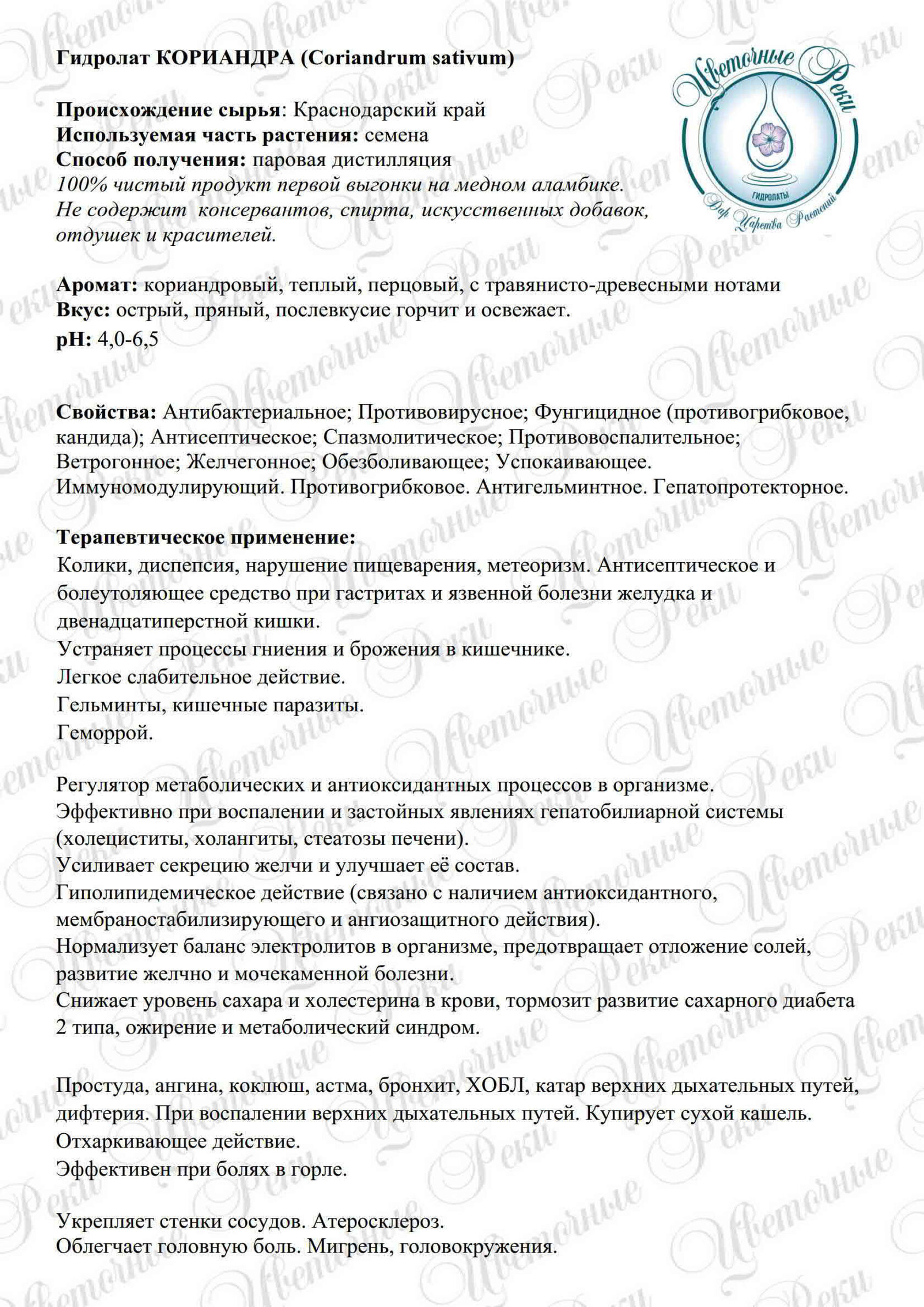 Аромат: кориандровый, теплый, перцовый, с травянисто-древесными нотами Свойства: Антибактериальное; Противовирусное; Фунгицидное (противогрибковое, кандида); Антисептическое; Спазмолитическое; Противовоспалительное; Ветрогонное; Желчегонное; Обезболивающее; Успокаивающее. Иммуномодулирующий. Противогрибковое. Косметические свойства: Подходит для любого типа кожи, особенно для жирной, комбинированной и проблемной. -очищает и восстанавливает, -выводит токсины, -снимает отеки, -тонизирует, увлажняет, нормализует секрецию сальных желез, освежает, -снимает воспаление и зуд, -восстанавливает, улучшает обменные процессы кожи, -природный антиоксидант, оказывает омолаживающее действие на зрелую кожу, улучшает цвет лица. -отличный ингредиент для антивозрастных средств; -придает коже упругость; -помогает убрать первые мелкие морщины; -снимает различные воспаление, угревые высыпания; -ускоряет заживление и регенерацию ран и ожогов; -не дает размножаться бактериям. -эффективен в случае акне и куперозе. -успокаивающий и противовоспалительный уход после эпиляции и бритья. -хорошо подготавливает кожу для нанесение кремов или масок.