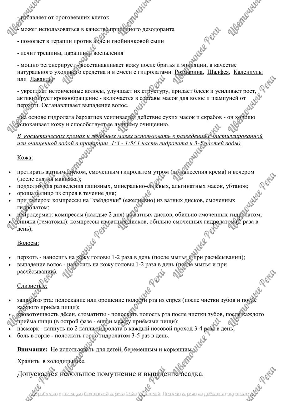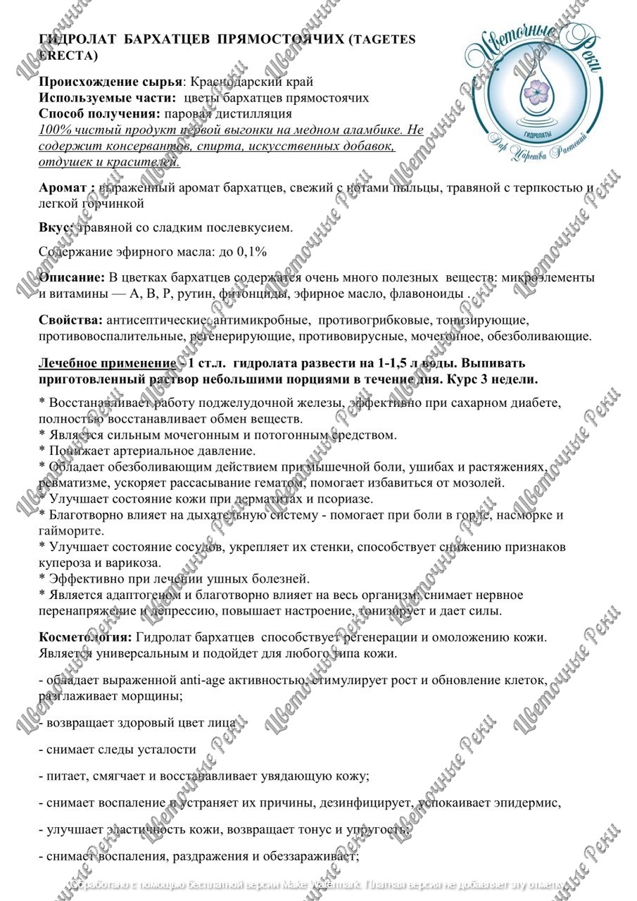 Аромат : выраженный аромат бархатцев, свежий с нотами пыльцы, травяной с терпкостью и легкой горчинкой. Свойства: антисептические, антимикробные, противогрибковые, тонизирующие, противовоспалительные, регенерирующие, противовирусные, мочегонное, обезболивающие. Косметология: способствует регенерации и омоложению кожи. Является универсальным и подойдет для любого типа кожи.