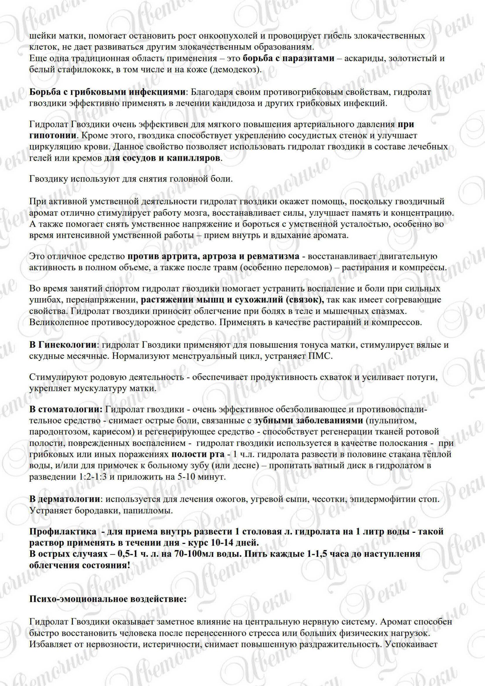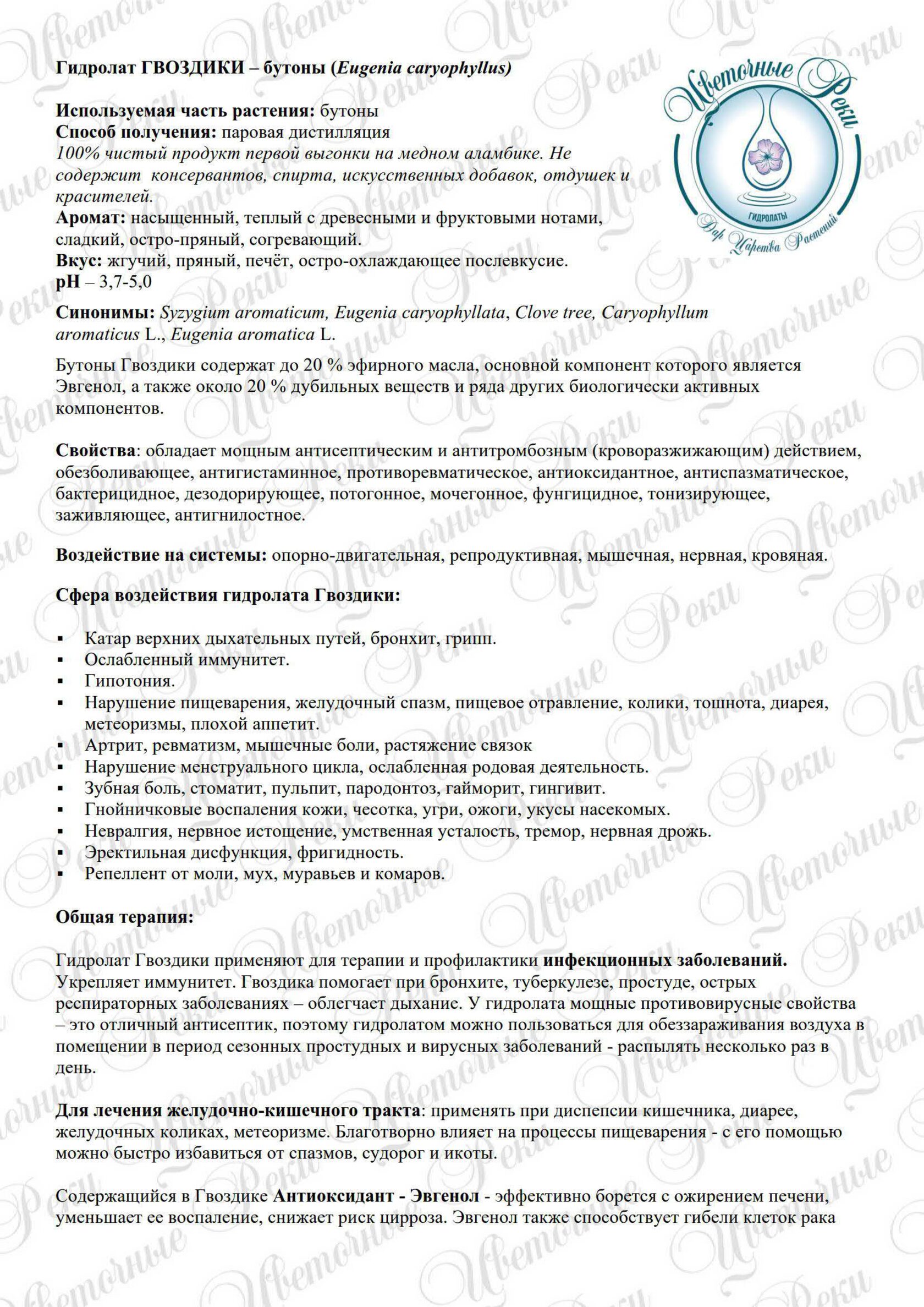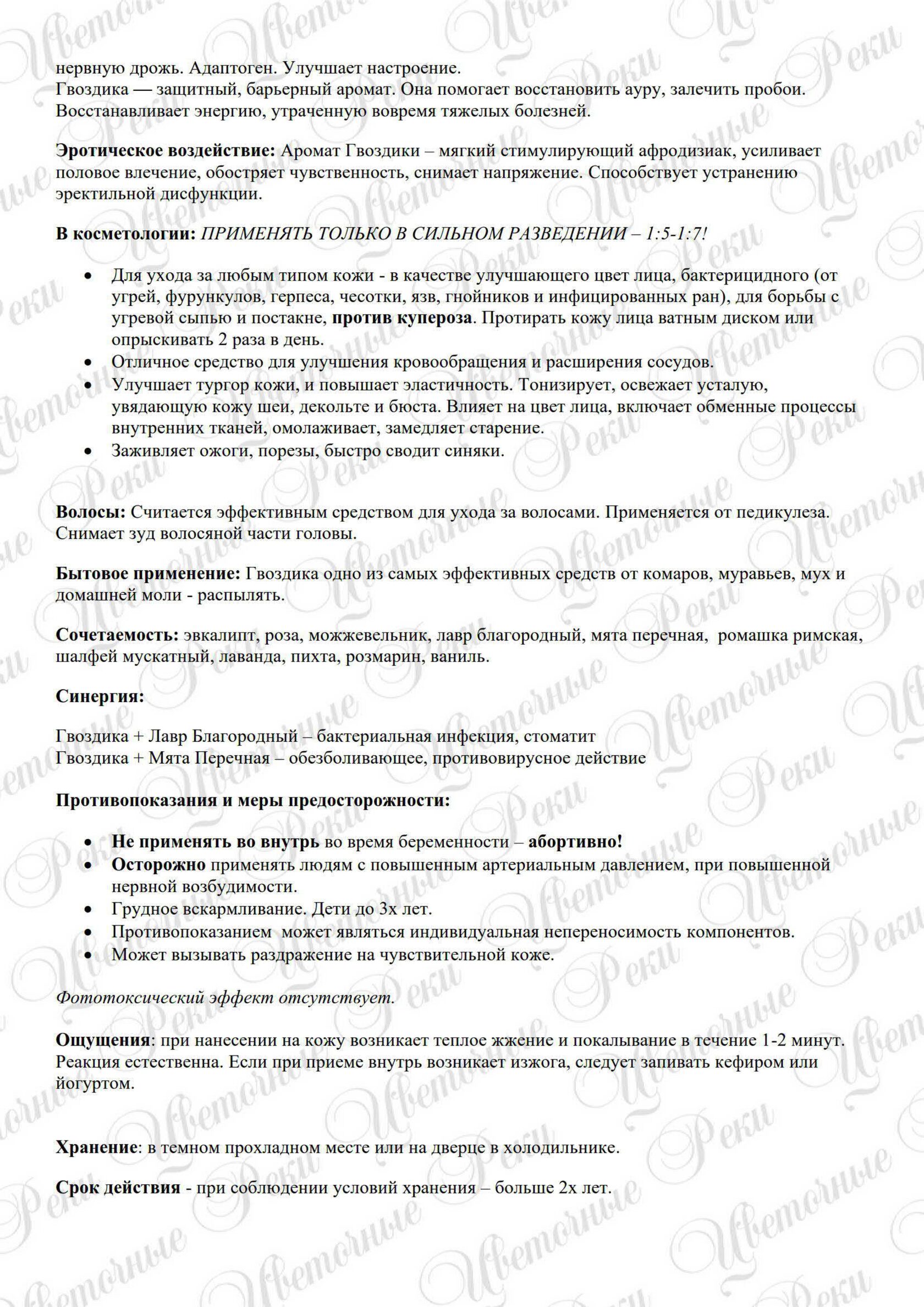 Аромат: насыщенный, теплый с древесными и фруктовыми нотами, сладкий, остро-пряный, согревающий. Свойства: обладает мощным антисептическим и антитромбозным (кроворазжижающим) действием, обезболивающее, антигистаминное, противоревматическое, антиоксидантное, антиспазматическое, бактерицидное, дезодорирующее, потогонное, мочегонное, фунгицидное, тонизирующее, заживляющее, антигнилостное. В КОСМЕТОЛОГИИ: ПРИМЕНЯТЬ ТОЛЬКО В СИЛЬНОМ РАЗВЕДЕНИИ— 1.5-1:7! -Для ухода за любым типом кожи -в качестве улучшающего цвет лица, бактерицидного(от угрей, фурункулов, герпеса, чесотки, язв, гнойников инфицированных ран), для борьбы с угревой сыпью и постпанке, против купероза. Протирать кожу лица ватным диском или опрыскивать 2 раза в день. -Отличное средство для улучшения кровообращения и расширения сосудов. -Улучшает тургор кожи и повышает эластичность. Тонизирует, освежает усталую, увядающую кожу шеи, декольте и бюста. Влияет на цвет лица, включает обменные процессы внутренних тканей, омолаживает, замедляет старение. -Заживляет ожоги, порезы, быстро сводит синяки.