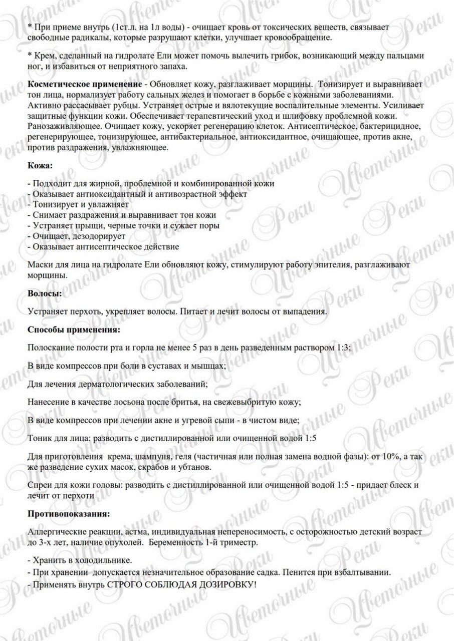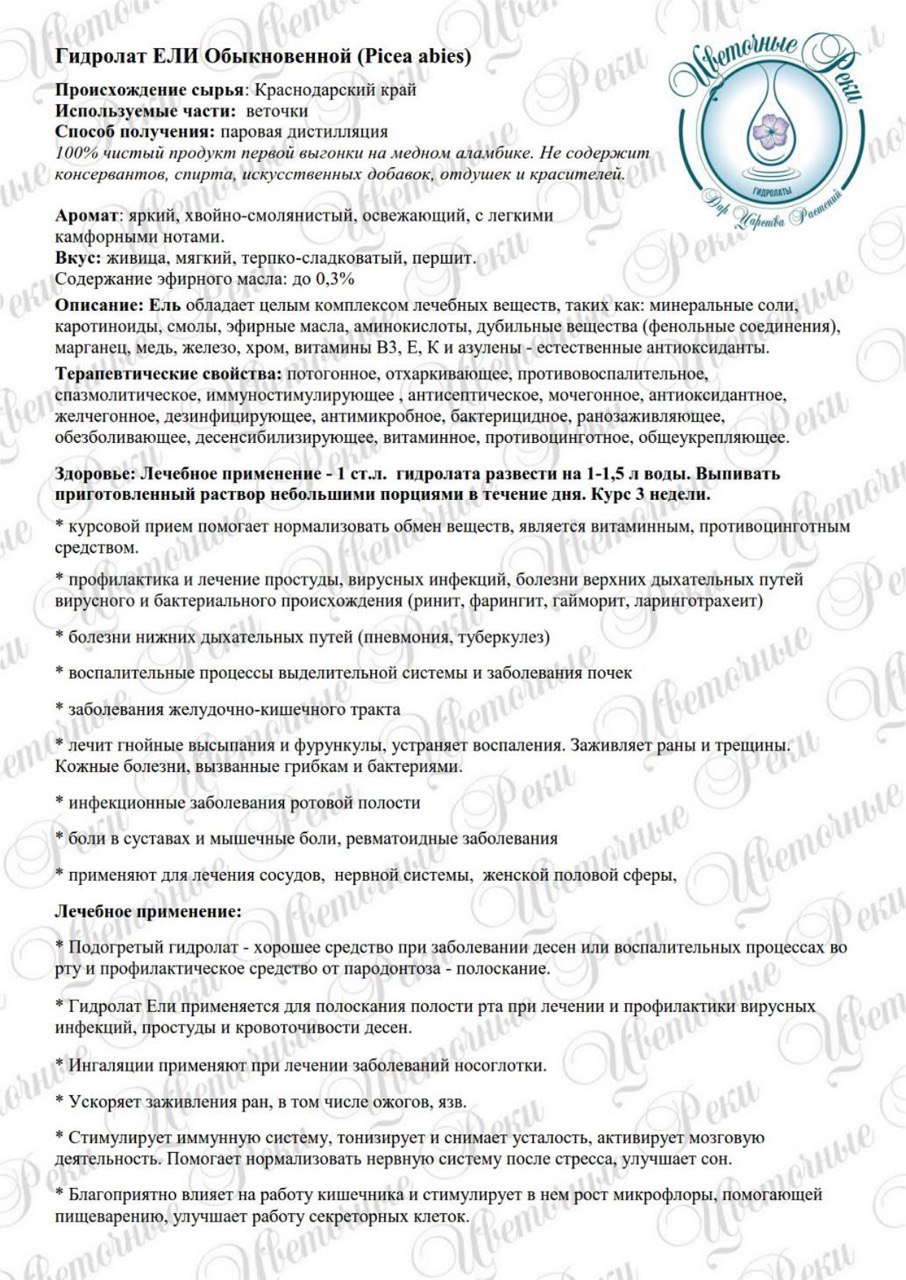 Аромат у гидролата яркий, хвойно-смолянистый, освежающий, с легкими камфорными нотами. Терапевтические свойства: потогонное, отхаркивающее, противовоспалительное, спазмолитическое, иммуностимулирующее , антисептическое, мочегонное, антиоксидантное, желчегонное, дезинфицирующее, антимикробное, бактерицидное, ранозаживляющее, обезболивающее, десенсибилизирующее, витаминное, противоцинготное, общеукрепляющее. Как и все хвойные, гидролат Ели активно борется с простудными и вирусными заболеваниями, укрепляя иммунитет и убирая проблемы в дыхательных путях! В Косметических целях: - Подходит для жирной, проблемной и комбинированной кожи - Оказывает антиоксидантный и антивозрастной эффект - Тонизирует и увлажняет - Снимает раздражения и выравнивает тон кожи - Устраняет прыщи, черные точки и сужает поры - Очищает, дезодорирует - Оказывает антисептическое действие