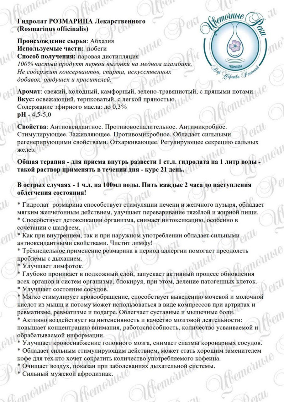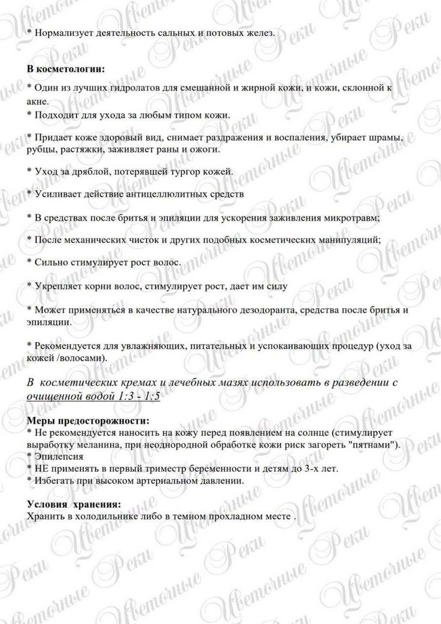 Аромат: свежий, холодный, камфорный, зелено-травянистый, с пряными на вкус. Свойства: Антиоксидантное. Противовоспалительное. Антимикробное. Стимулирующее. Заживляющее. Противомикробное. Обладает сильными регенерирующими свойствами. Отхаркивающее. Регулирующее секрецию сальных желез. В косметологии: Один из лучших гидролатов для смешанной и жирной кожи, и кожи, склонной к акне. Придает коже здоровый вид, снимает раздражения и воспаления, убирает шрамы, растяжки, заживляет раны и ожоги. Уход за дряблой, потерявшей тургор кожей. Усиливает действие антицеллюлитных средств
