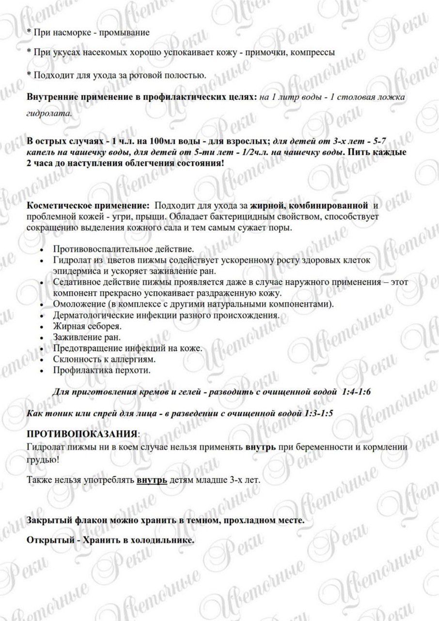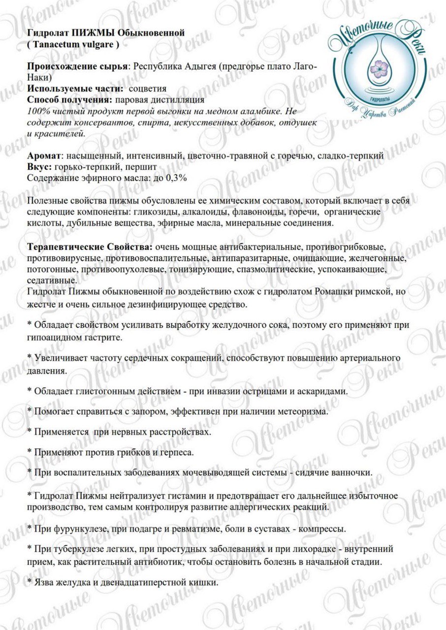 Аромат у гидролата насыщенный, интенсивный, цветочно-травяной с горечью, медово-терпкий. Лечебные свойства: очень мощные антибактериальные, противогрибковые, противовирусные, противовоспалительные, антипаразитарные, очищающие, желчегонные, потогонные, противоопухолевые, тонизирующие, спазмолитические, успокаивающие, седативные. Косметическое применение: При проблемной коже - угри, прыщи, герпес. Подходит для ухода за жирной, комбинированной и проблемной кожей. Обладает бактерицидным свойством, способствует сокращению выделения кожного сала и тем самым сужает поры.
