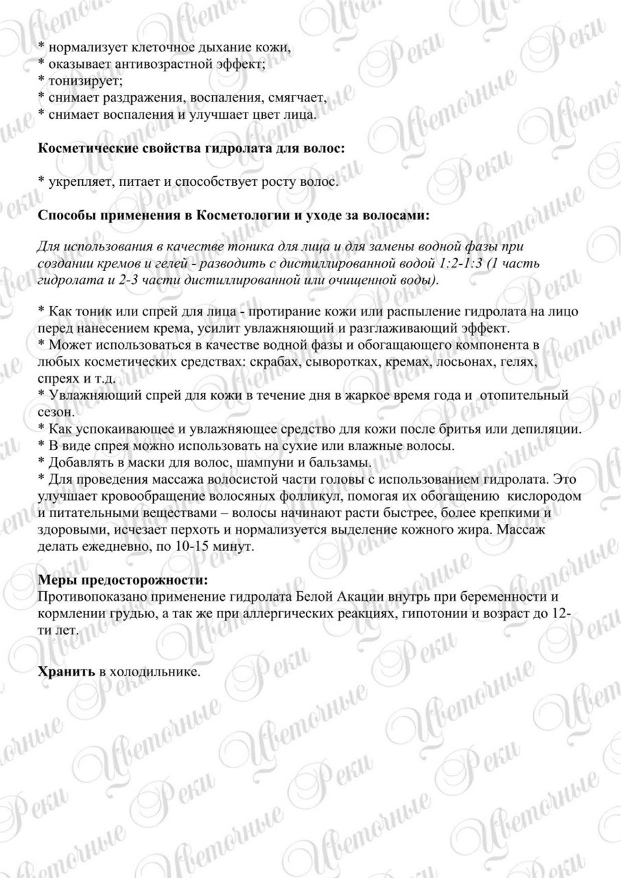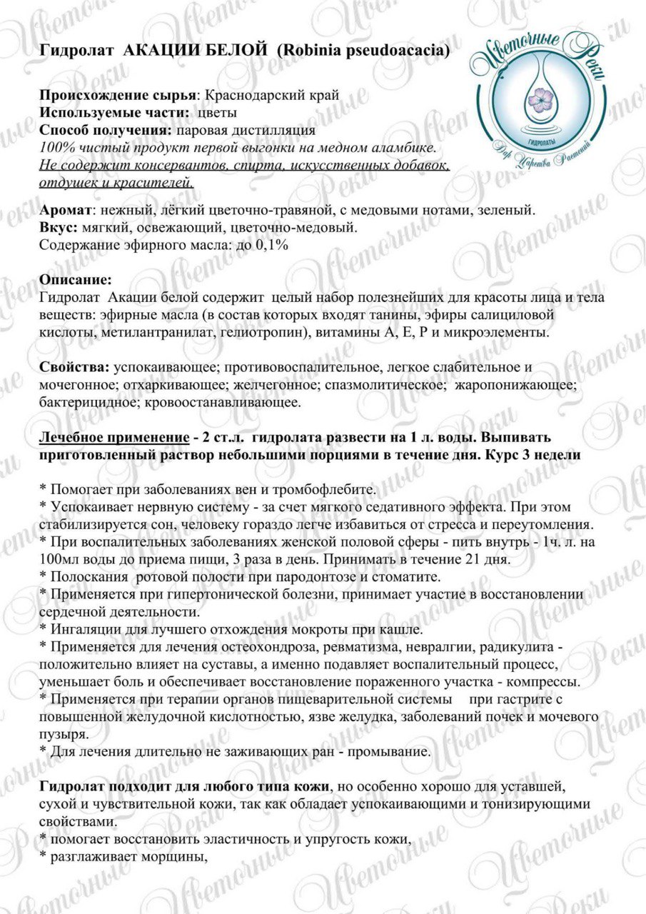 Аромат у гидролата нежный, лёгкий цветочно-травяной, с медовыми нотами, зеленый. Лечебные Свойства: успокаивающее; противовоспалительное, легкое слабительное и мочегонное; отхаркивающее; желчегонное; спазмолитическое; жаропонижающее; бактерицидное; кровоостанавливающее. Главное достоинство гидролата Белой Акации - это разжижение крови, соответственно он будет помогать тем, у кого есть заболевания вен и тромбофлебит (внутренний прием). Помимо остальных лечебных свойств Акация очень хорошо успокаивает нервную систему - за счет мягкого седативного эффекта. При этом стабилизируется сон, человеку гораздо легче избавиться от стресса и переутомления. В косметологии гидролат Акации подходит для любого типа кожи, но особенно хорошо для уставшей, сухой и чувствительной кожи, так как обладает успокаивающими и тонизирующими свойствами.