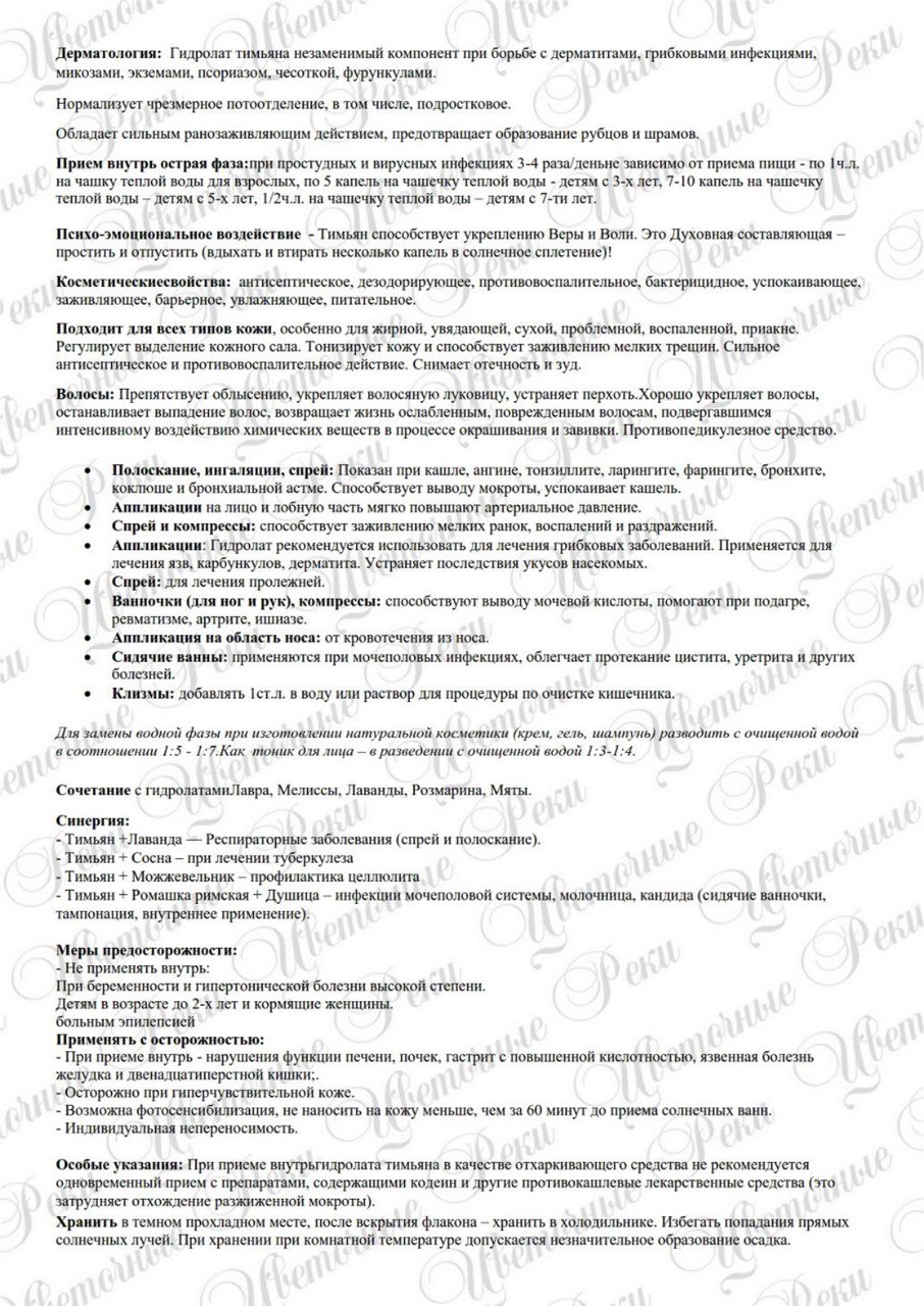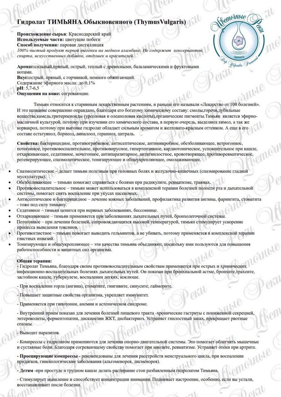 Аромат у гидролата Тимьяна просто необыкновенный - сильный, пряный, острый, теплый с древесными, бальзамическими и фруктовыми нотами. Свойство:. - Спазмолитическое – делает тимьян полезным при головных болях и желудочно-кишечных (спазмирование гладкой мускулатуры). - Обезболивающее – тимьян помогает справиться с болями при радикулите, ревматизме, травмах. - Противовоспалительное – тимьян может использоваться в комплексной терапии болезней полости рта и дыхательной системы, помогает снять воспаление при укусах насекомых. - Антисептическое и бактерицидное – лечение кожных заболеваний, профилактика развития ангины, фарингита, стоматита - тоже под силу тимьяну. - Седативное – тимьян ценится при нервных заболеваниях, бессоннице. - Отхаркивающее – тимьян применяется при заболеваниях дыхательных путей, бронхолегочной системы. - Потогонное – при лечении болезней, сопровождающихся высокой температурой, тимьян стимулирует ускорение процесса выведения токсинов. - Противоглистное – тимьян помогает выводить гельминтов, а не убивать, поэтому применяется в комплексной терапии глистных инвазий. - Тонизирующее и общеукрепляющее – эти качества тимьяна объединяют, поскольку ими пользуются для повышения работоспособности и защитных сил организма. Косметические свойства: антисептическое, дезодорирующее, противовоспалительное, бактерицидное, успокаивающее, заживляющее, барьерное, увлажняющее, питательное. Подходит для всех видов кожи для жирной, увядающей, сухой, проблемной, воспаленной,